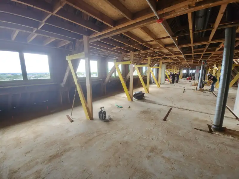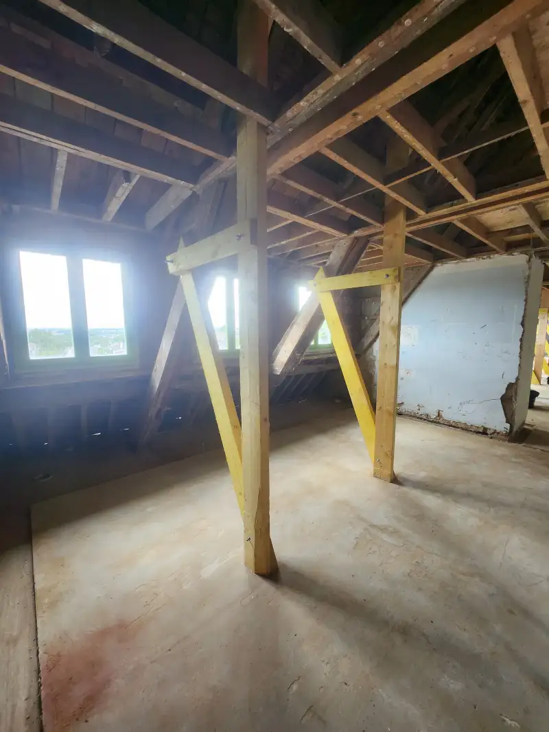Le curage a visé à déshabiller l’étage de ses éléments non structurels afin de révéler l’état réel des bois : dégradations biologiques (xylophages, champignons), humidité confinée, fissurations, affaiblissements d’assemblages. Chaque découverte a été documentée (photos, relevés, fiches) pour nourrir la future note de synthèse. Le BET structure a pu compléter les sondages, recueillir des mesures de flèche et préciser les hypothèses de calcul. Cette approche evidence-based évite des estimations trop conservatrices ou, au contraire, des sous-dimensionnements risqués.