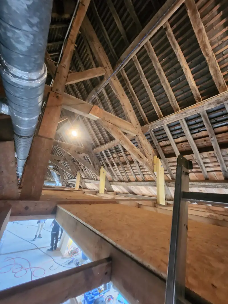 Le bâtiment présentait des incertitudes sur l’état mécanique de certaines poutres, entraits, arbalétriers et assemblages bois. Les combles accueillaient divers équipements techniques (ventilation, fluides), rendant l’accès sensible. Les mesures conservatoires devaient :