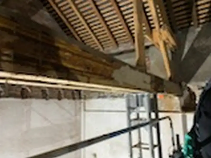 Toujours à la gare de Quimper, un autre secteur présentait un solivage très dégradé rendant la réparation ponctuelle inopérante. Notre mission : déposer sélectivement le plancher, reconstruire à neuf en bois, conserver la couverture et les éléments supérieurs, tenir les délais d’exploitation et gérer les aléas (présence de peintures au plomb) signalés lors de l’ouverture. L’opération a combiné techniques de charpente traditionnelle et renforts modernes (moisage vissé-collé à l’époxy), ainsi que la reconstitution d’appuis de ferme sur la base d’un diagnostic de BET structure.