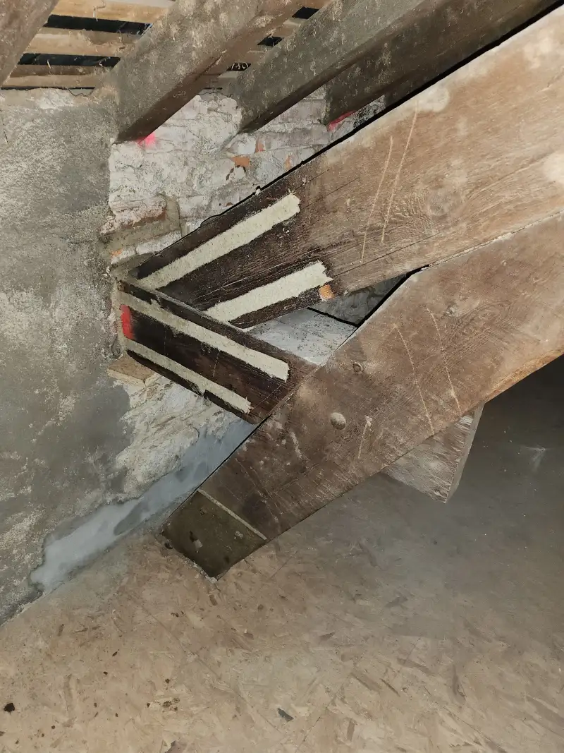 reconstruction plancher bois, solivage dégradé, résine époxydique, moisage, appui de ferme, charpente traditionnelle, couverture maintenue, chantier en site occupé, contrôle de flèche, gare de Quimper.