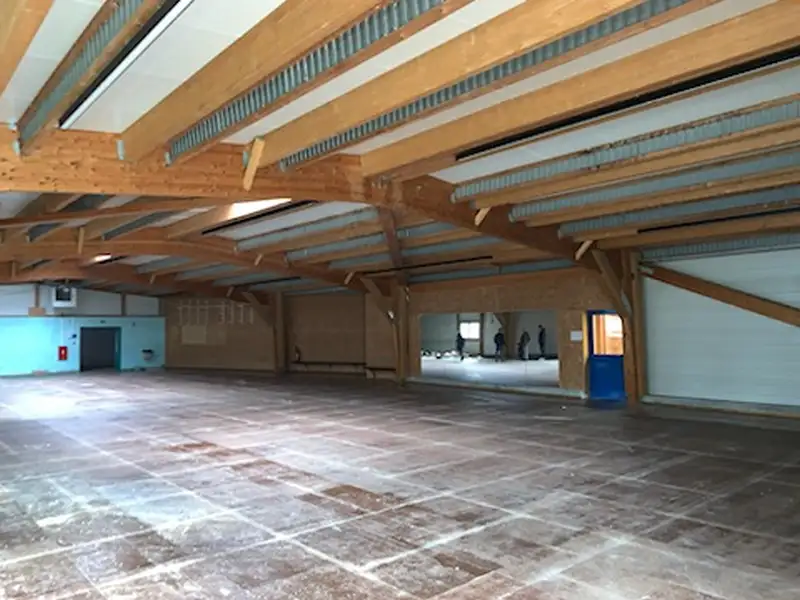 Les portiques lamellé-collé supportant la toiture présentaient, sur certaines travées, des réserves de capacité insuffisantes vis-à-vis de la surcharge. La solution a consisté à moiser les reins des portiques par des pièces adjointes lamellé-collé, ajustées au rayon, qui augmentent l’inertie locale et abaissent les contraintes en fibre tendue/comprimée. Les liaisons (tirefonds/vis structurelles + colle structurale) ont été dimensionnées pour reprendre les efforts de flexion et cisaillement supplémentaires. Les assemblages au droit des semelles et nœuds ont été revus, avec, si besoin, ajout de platines/feuillards pour répartir uniformément les efforts.
