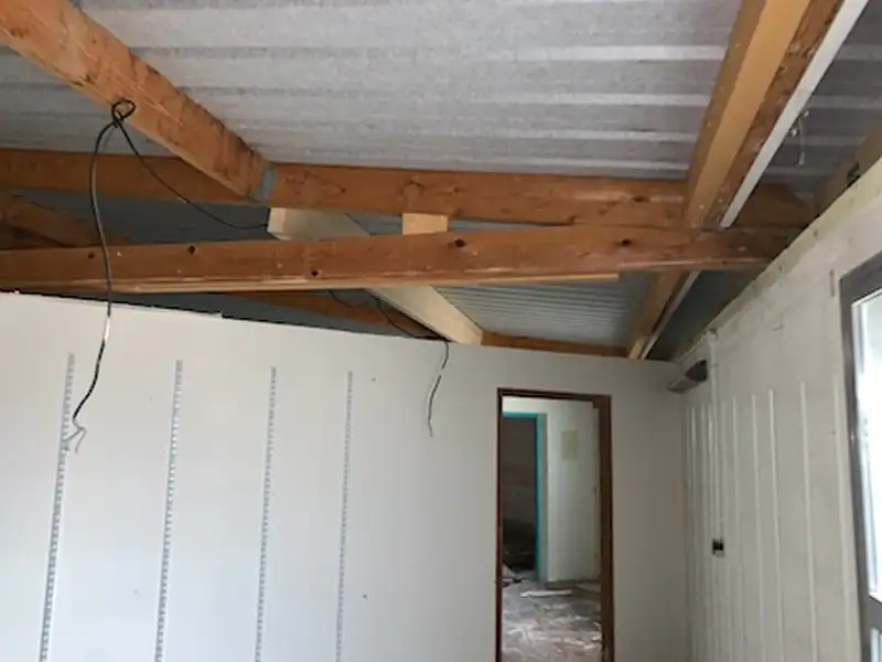 Description : Renforcement global de la charpente lamellé-collé : moisage, étrésillons, entrait retroussé, contrôle des flèches et reprise de charges sécurisée.