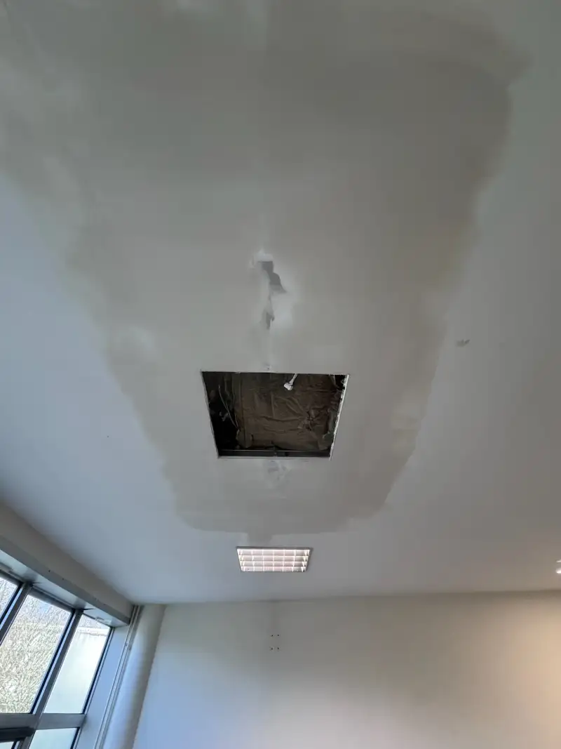Lors d’un incident de manutention (palette déposée en toiture), une panne bois s’est fissurée/cassée, menaçant la stabilité locale d’un plafond de bureau. L’objectif : sécuriser immédiatement, renforcer sans tout déposer, justifier techniquement et rendre le bureau opérationnel en un délai court. Nous avons mobilisé une équipe urgence charpente, un BET structure, et déployé un moisage vissé-collé ciblé, suivi d’une restitution des finitions (plaques, luminaires, peinture).