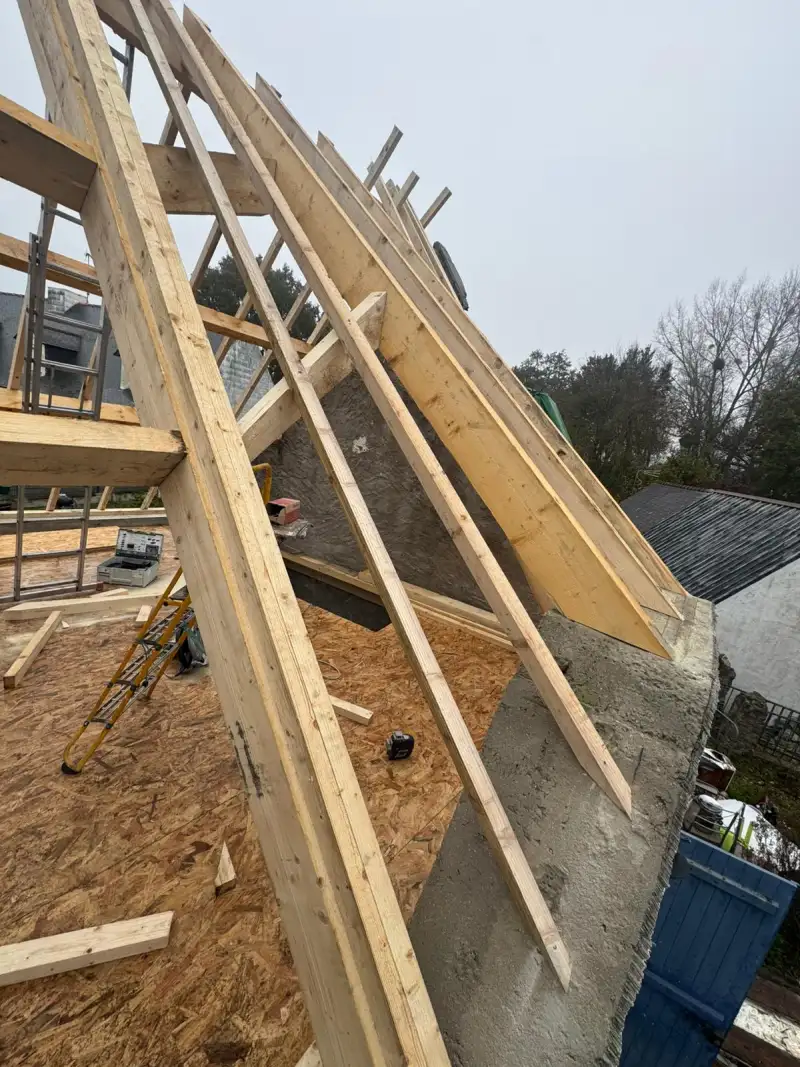 Le couvreur chaumier exige une charpente plane, des lignes stables, des débord adéquats et des fixations compatibles. Nous avons co-conçu les portées, entraxes et points singuliers (noues, rives, égouts) pour accueillir le chaume et assurer ventilation et écoulement maîtrisés. Les levages ont été synchronisés afin de limiter l’exposition aux intempéries et de préserver les niveaux inférieurs.