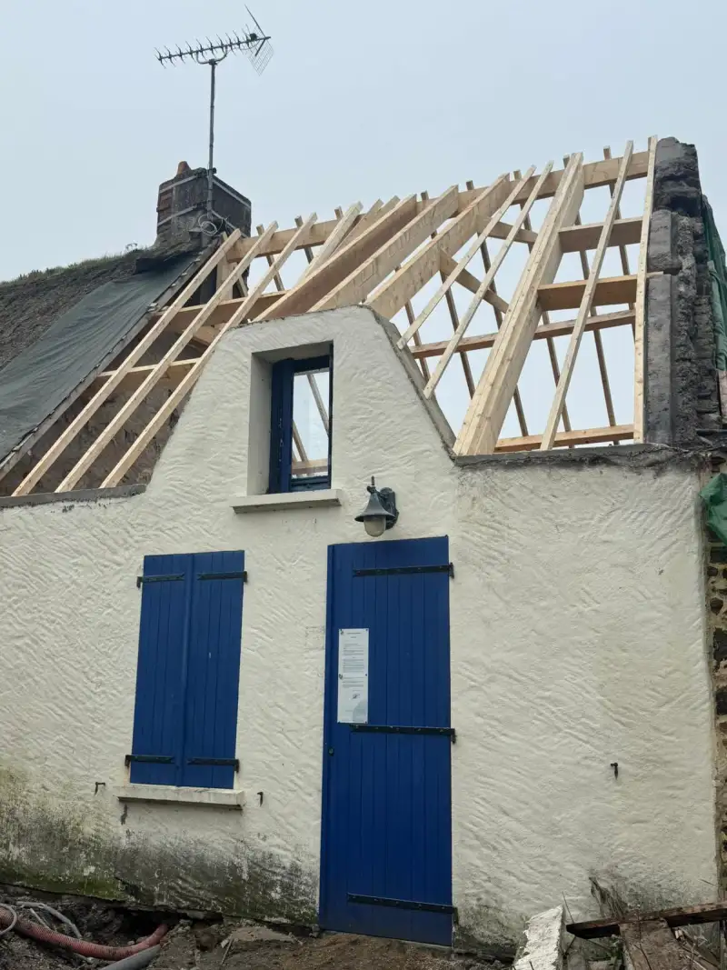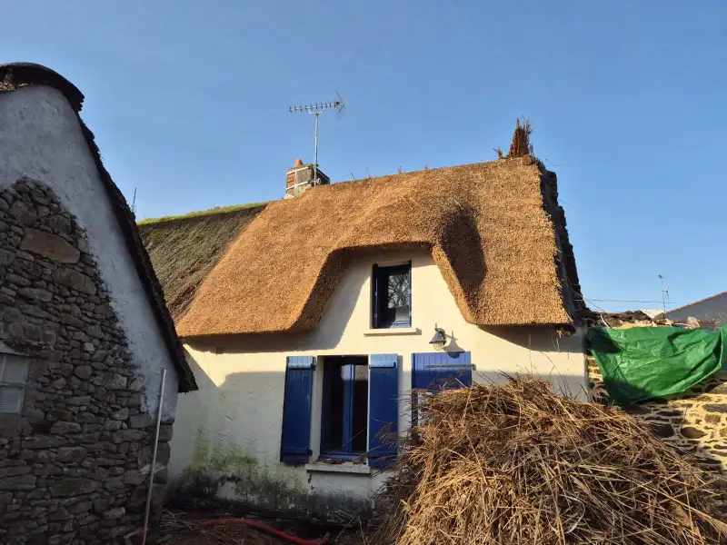 Description : Reconstruction après sinistre d’une maison en toit de chaume, Brière : charpente, menuiseries extérieures, plâtrerie, coordination assurance–MOE, restitution soignée finale.